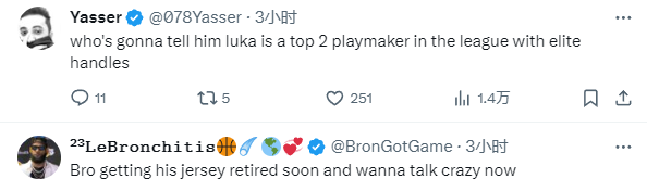 库铂质疑东契奇的言论引争议,有球迷表示:这个家伙一无所知;还有球迷表示:如果他能以场均 30分的三双带领球队进入总决赛,那么他速度慢也没关系;更有球迷表示:谁能告诉他卢卡是联盟前二控卫之一,他的球衣快退役了,所以他现在想说点疯狂的话。