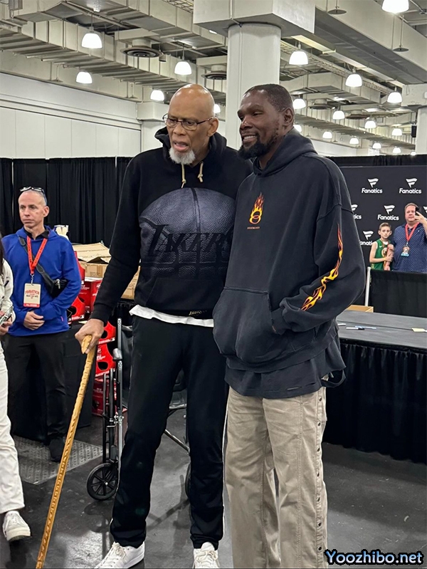 值得一提的是,NBA名宿贾巴尔拄着拐杖来到活动现场,杜兰特笑着与其合影留念。