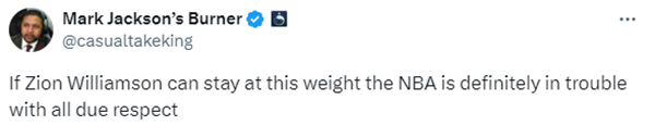 有球迷表示:如果锡安能保持这个体重,那么NBA 肯定会陷入困境;还有球迷表示这是锡安生涯最好的体型,联盟大结局了。