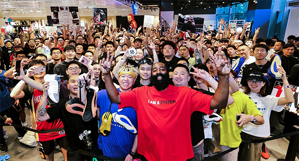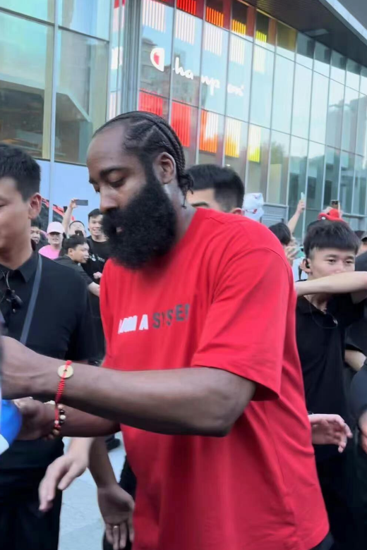 哈登站在C位与球迷合影,身穿一件印有“我就是一个体系”字样的红色T恤,这个口号十分醒目,这句话是哈登加盟快船后在发布会上说的话,当时哈登说:我不是体系球员,我就是一个体系。