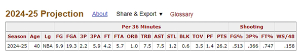 来源:直播车08-18 12:54直播车讯 2024年巴黎奥运会已经结束,詹姆斯带领美国男篮夺得金牌,那么老詹会在NBA新赛季打出怎样的表现?美知名数据网站BBR预测詹姆斯新赛季数据:每36分钟拿到26.2分7.5篮板7.5助攻1.2抢断,投篮命中率是51.3%,三分命中率为36.6%,罚球命中率是74.7%。