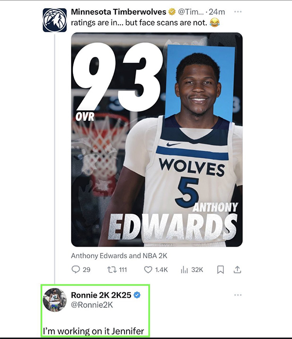 爱德华兹的2K25能力值为93,与布克、布伦森并列第11位,不过森林狼官推对一直以来爱德华兹的面补问题向2K官方督促改进。森林狼官推晒出一张PS图,并写道:“能力值很可以,就是面部扫描不行。