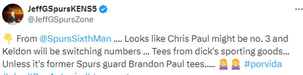 马刺记者报道,体育用品商店已经开始出售印有“3号”和“保罗”字样的训练T恤和球衣,Jeff表示:看起来保罗将穿马刺3号,凯尔登将会换号。