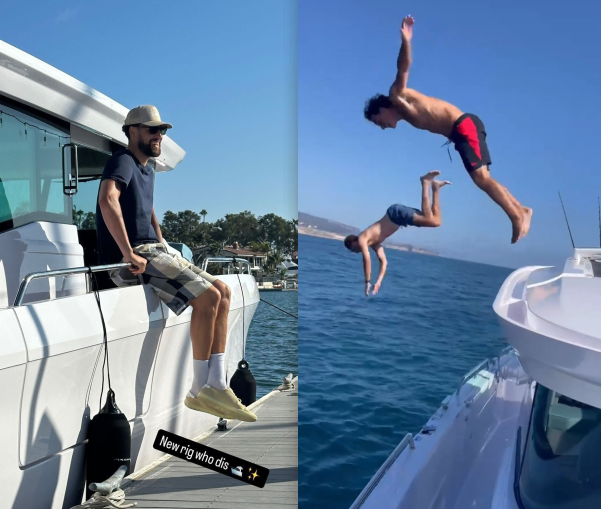 来源:直播车08-30 13:17直播车讯 今夏独行侠新援克莱-汤普森玩嗨了,训练度假尽享休赛期;不久前,汤普森通过社媒晒出他新买的一条船,坐在船上咧嘴大笑;他还晒出开船出海并且与友人一起从船上跳进大海里以及开着船与海豚并行。