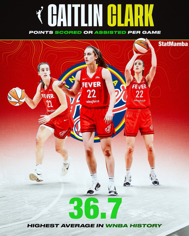6、克拉克场均得分以及助攻得分为36.7分,也创 WNBA历史上单赛季最佳纪录