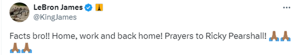 詹姆斯的好友转发新闻并发推写道:我真的只想待在家里;詹姆斯回复好友:兄弟说的没错!!居家,上班然后回家,为Ricky Pearsal祈祷!