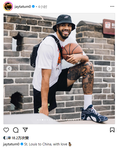 塔图姆晒中国行组照,其中就包括他抱着篮球游玩长城的帅照,配文写道:从圣路易斯到中国,带着爱。