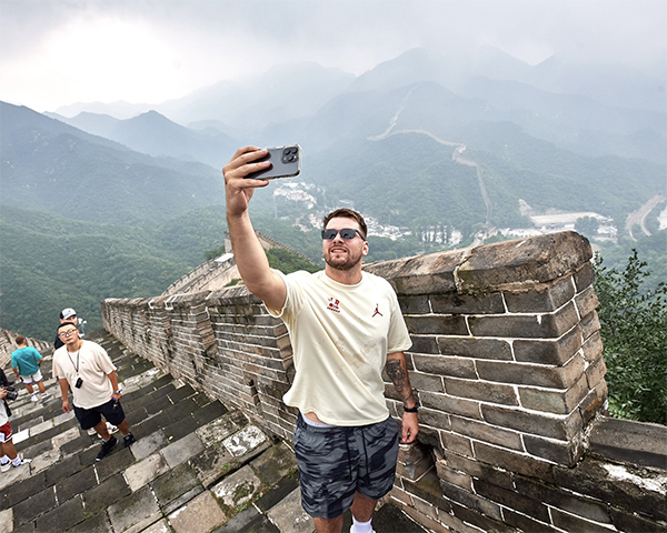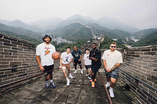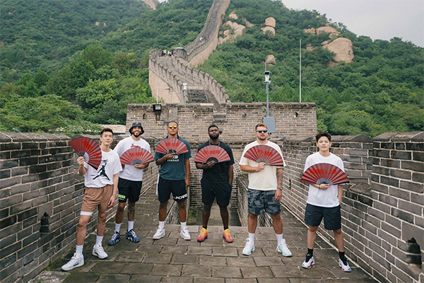 结束上海站的活动后他们来到北京,广州男篮球员郭艾伦和中国女篮球员杨舒予陪同NBA四大球星一起畅游长城,塔图姆戴着小黑帽、抱着篮球爬长城,锡安仍旧戴着一串珠子,东契奇和班凯罗戴着墨镜出行,合影时他们站在长城上手持纸扇以及变换姿势摆拍。
