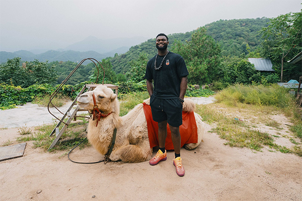 锡安手持印有“北京”字样的纸扇与长城合影,还双手抄兜与骆驼合影;对于畅游长城,锡安感叹:太不可思议了,是篮球把我带到了这里。