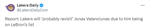 今夏湖人在自由球员市场上没有什么作为,想要引援的球星都去别队了;不过湖人可能在赛季中期补强阵容,据湖人记者Buha报道,目前湖人仍对瓦兰丘纳斯保持着兴趣,他在詹姆斯的名单上,湖人可能会重新考虑他,他更像是湖人队的中低级别的交易目标。