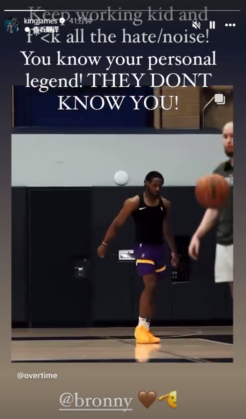 今日,詹姆斯转发了布朗尼回到高中母校训练的视频,配文写道:继续加油孩子,让黑子/噪音滚蛋吧,你知道自己的传奇,他们不了解你!