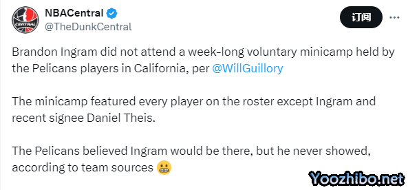 除了英格拉姆和刚刚签约的泰斯之外,鹈鹕队其他球员都参加了这次训练营;值得一提的是,英格拉姆过去曾多次为他的队友组织这样的迷你训练营。