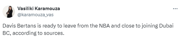 据悉,阿联酋迪拜BC篮球俱乐部队刚刚成立,他们将首次通过参加欧洲ABA联赛,正在设法引援贝尔坦斯。