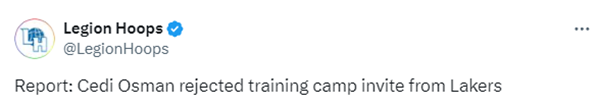 欧洲记者Nikola Miloradovic跟进报道,奥斯曼拒绝了湖人提供的训练营合,他此前收到来自湖人队的兴趣,湖人以训练营合同向他发起邀请,但由于合同缺乏保障,无法保证他能进入球队轮换阵容,他最终决定拒绝并重返欧洲。