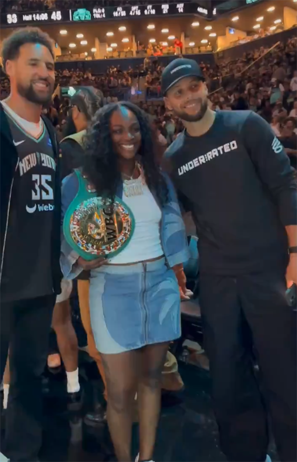 库里和克莱还与拿着金腰带的克拉丽莎-希尔兹合影留念。