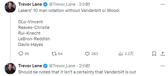 湖人记者Trevor Lane表示,没有伍德和范德彪的话,湖人10人轮换为詹姆斯、浓眉、拉塞尔、八村垒和里夫斯首发,海斯担任浓眉替补,克里斯蒂担任里夫斯的替补,克内克特担任八村垒的替补,文森特和雷迪什也替补进入轮换阵容。