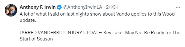 上赛季伍德、文森特和范德比尔特都遭遇伤病的困扰,他们的伤情反反复复,严重拖累了球队的计划;现在湖人又遭伤病,伍德至少伤停两个月,范德彪可能缺席训练营,Anthony-Irwin最新报道,范德彪可能还没有为新赛季做好准备。