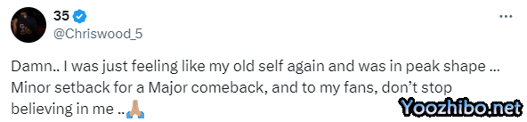 28岁伍德又伤了,接受手术后伍德发推写道:该死的…我刚刚感觉自己又恢复了原来的样子,状态也很好……为了强势的回归,我遭遇了小小的挫折,我的球迷们,请不要停止相信我。