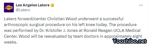 湖人官方宣布,伍德今天成功接受了左膝关节镜手术,手术是由加州大学洛杉矶分校罗纳德-里根医疗中心的克里斯托弗-琼斯医生做的,预计伍德将在八周后接受复查。