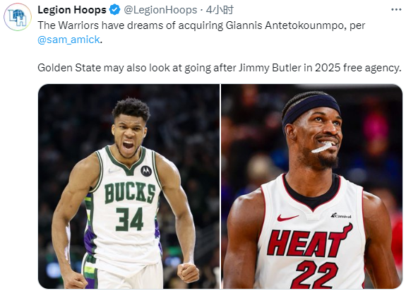 来源:直播车09-17 12:11直播车讯 据名记Sam Amick报道,勇士队一直以来都梦想着得到字母哥,金州勇士也可能考虑在2025年的自由市场上追逐吉米-巴特勒。