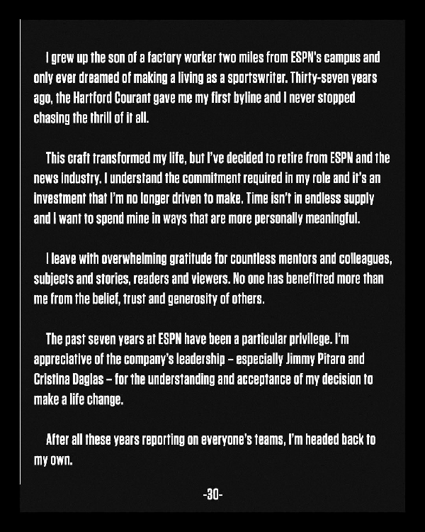 这份工作改变了我的生活,但我决定从ESPN和新闻行业退休。我理解我的角色所要承担的责任。这是一项我不再被迫做出的投资。时间是无尽的,我想以更有个人意义的方式度过我的时间。