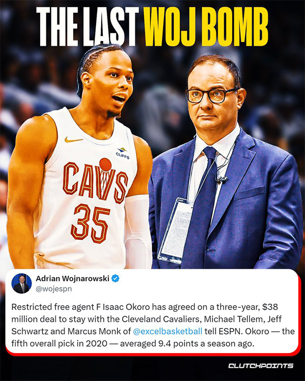 woj记者生涯报道的最后一条消息是骑士与奥科罗达成3年3800万美元的续约合同,美媒直言一个时代结束了。