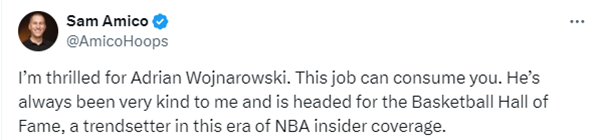 Sam Amico则发推表示:我为Adrian Wojnarowski感到高兴,这份工作会让你精疲力竭。他对我一直很好,他是 NBA内部报道时代的潮流引领者。
