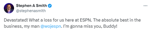 ESPN总裁Jimmy Pitaro发表声明:自从2007年我们一起在雅虎共事以来, 我就认识了Woj,并且非常钦佩他。他的职业精神是首屈一指的。他才华横溢,无所畏惧,他在ESPN引领了这个行业,他对于这个行业和球迷的贡献是传奇性的。虽然我们会怀念他每天的产出内容,但我们完全理解他改变生活方式、放慢生活节奏的决定。我们知道他将在新的篇章中继续茁壮成长,我们整个集体都对他表示感谢和支持。