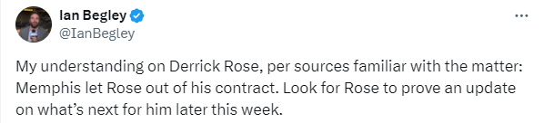 纽约记者Ian Begley进一步报道,联盟消息人士证实了灰熊裁掉罗斯,但我的消息源透露是罗斯自己想走,灰熊同意与罗斯解约,本周晚些时候,罗斯将公布他下一步计划的最新进展。