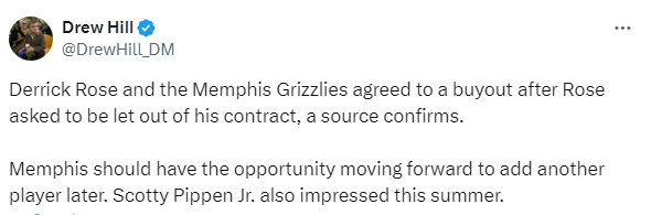 灰熊记者Drew Hill报道,消息人士透露,在德里克-罗斯要求解除合同后,他与灰熊达成了买断;灰熊应该会再引进一名球员,小斯科特-皮蓬在今夏的表现很出色。
