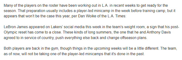 据湖人记者Dan Woike报道,尽管接下来几周事情会有所不同,但湖人球员目前都回到了球馆。到目前为止,球队不会像过去那样采取球员主导的迷你训练营;湖人队的训练营将于下周开始,过去多年,詹姆斯都会在球队训练营开始前牵头组织迷你训练营,但这不会发生在今年。