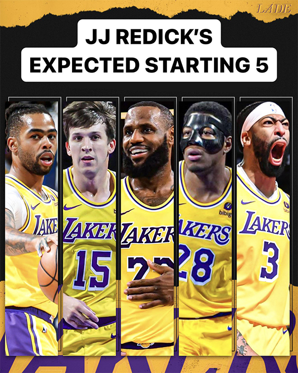 来源:直播车09-25 12:00直播车讯 北京时间9月25日/讯近日,湖人新主帅JJ-雷迪克在节目中透露湖人新赛季的首发阵容,雷迪克直言湖人新赛季将使用上赛季取得23胜10负的那套首发阵容。雷迪克所说的首发阵容为:勒布朗-詹姆斯、安东尼-戴维斯、丹吉洛-拉塞尔、奥斯汀-里夫斯、八村垒。