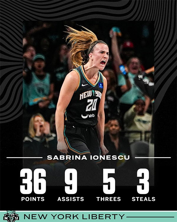 来源:直播车09-25 11:58直播车讯 北京时间9月25日,WNBA季后赛首轮G2,纽约自由人91-82击败亚特兰大梦想,大比分2-0横扫晋级半决赛,被称为“女库里”的约内斯库大爆发,全场出战39分钟,23投12中、三分11中5、罚球7中7独砍36分9助攻3抢断,正负值+11,带队晋级半决赛。