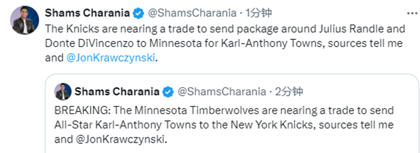 重磅!尼克斯森林狼完成交易,3换1引入唐斯 兰德尔等告别