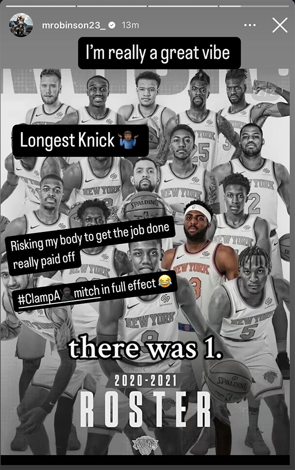 目前米切尔-罗宾逊是尼克斯现有阵容中为球队效力时间最长的球员;尼克斯促成唐斯大交易后,米罗更新社媒晒照并且配文写道:2020-21赛季的独苗,目前尼克斯队内效力时间最长的人。
