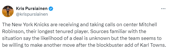 据CBS记者Kris Pursiainen报道,在引入唐斯后,尼克斯正在听取米切尔-罗宾逊的交易报价。熟悉情况的消息人士表示,这笔交易的可能性尚不清楚,但得到唐斯后,尼克斯似乎愿意再做一次尝试。