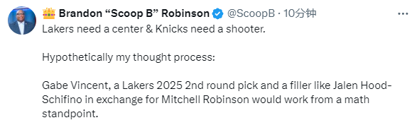 尼克斯可能交易米罗,名记Brandon Robinson表示,湖人需要一个中锋,尼克斯需要一个投手,湖人可以用文森特、席菲诺和1个2025年次轮签,从尼克斯换来米切尔-罗宾逊。