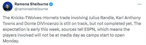 据ESPN名记Ramona Shelburne报道,关于森林狼将唐斯交易至尼克斯,换回兰德尔、迪文岑佐和一个首轮签,以及黄蜂从尼克斯得到杰弗里斯和选秀资产的三方交易,目前尚未完成。该笔交易目前仍在进行中,预计交易将在本周初段完成。这意味着交易中所涉及到的球员,都无法参加各自球队的媒体日活动以及新赛季训练营的第一天。