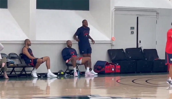 小卡身穿快船队训练服来到训练场,先是与球队的理疗人员聊了几句,之后与坐在场边休息的PJ-塔克、巴图姆等人击掌,并且与塔克开怀热聊;小卡还在球场上与泰伦-卢交流,小卡咧嘴大笑,心情很不错。