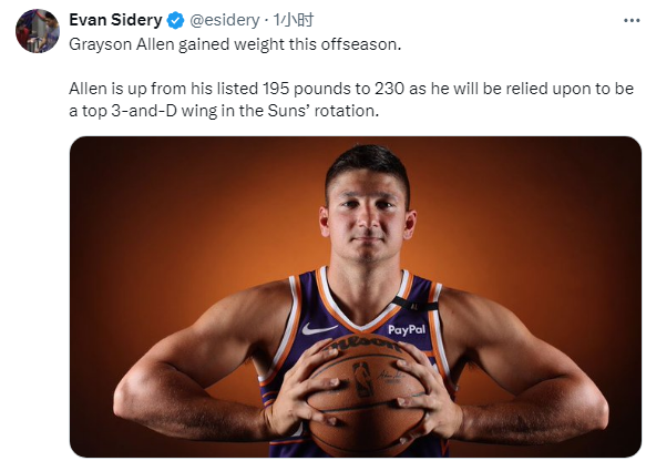 来源:直播车10-03 15:54直播车讯 北京时间10月3日,太阳神射格雷森-阿伦自曝他在休赛期疯狂增重,目前体重为230磅(约209斤),此前阿伦登记的体重是195磅(约177斤),换言之,这个休赛期阿伦疯狂增重32斤;NBA记者Evan Sidery表示,预计他将在太阳的轮换阵容中担任顶级的3D侧翼球员。