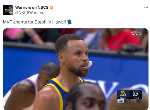 第二节库里三分继续打铁,9分多钟库里反跑上篮终于打进运动战进球,库里吸引防守为队友创造机会,梅尔顿轰进三分,勇士一波10-5反超比分;暂停回来,勇士与快船对攻,库里过掉哈登上篮得分,库里撤步三分造邓恩犯规并且三罚全中,现场有球迷为库里高呼MVP。