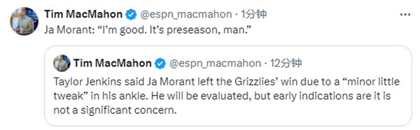 赛后灰熊主教练泰勒-詹金斯表示莫兰特因脚踝轻微扭伤而退出了本场比赛,他将接受评估,但初步迹象表明这不是什么大问题。