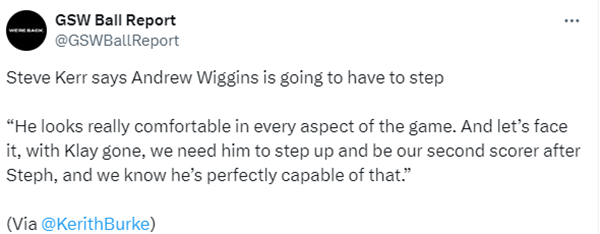 科尔表示维金斯将是勇士队内仅次于库里的第二得分手,科尔表示:“我已经告诉过他:一场投六个三分球;他是一名非常出色的三分投手。去年的三分球命中率有点下降,但自从他来到这里以来,他的三分命中率有39%、40%。我想要他投很多三分球,我想要很多对篮筐的攻击。去年下半年,他罚球命中率超过了80%。”。