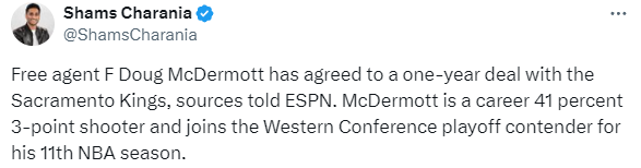 来源:直播车10-17 12:14直播车讯北京时间10月17日,据ESPN记者Shams Charania报道,自由球员前锋道格-麦克德莫特已同意与萨克拉门托国王队签订一份为期一年的合同;麦克德莫特职业生涯三分命中率为 41%,他将加入这支西部季后赛争夺者,迎来自己的第11个NBA赛季。