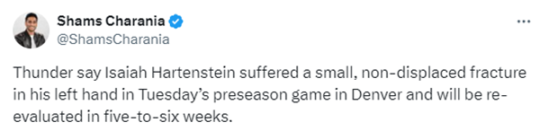 来源:直播车10-18 09:26直播车讯西部的雷霆队遭重创,据名记shams报道,雷霆队官方宣布,哈滕施泰因在周三对阵掘金的季前赛中左手遭遇轻微骨折,但未发生移位,他将在5-6周后接受重新评估。