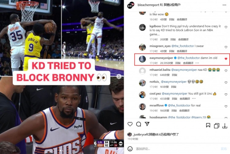 一位球迷评论道:杜兰特在一场NBA比赛中封盖詹姆斯的儿子,听起来真是太疯狂了...