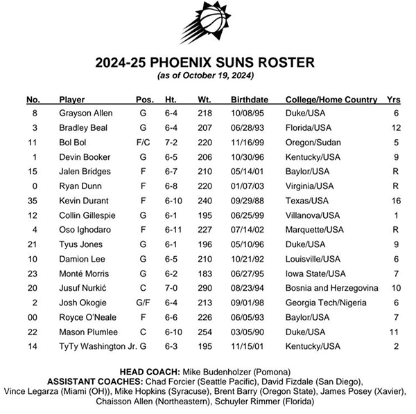 14名常规合同球员:杜兰特、比尔、布克、努尔基奇、格雷森-阿伦、罗伊斯-奥尼尔、奥科吉、邓恩、波尔-波尔、泰厄斯-琼斯、达米恩-李、蒙特-莫里斯、普拉姆利和伊戈达罗