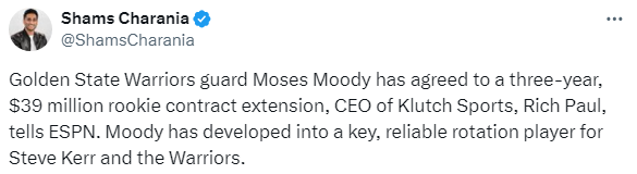 前两天,Shams曾在节目中表示:穆迪目前有机会完成续约,(相比库明加)金州勇士更有可能完成这样的交易,这个季前赛到目前为止,穆迪表现得非常出色,勇士相信他可以承担起一个真正的轮换角色,如果穆迪能做到,他们绝对想要敲定这份合同。