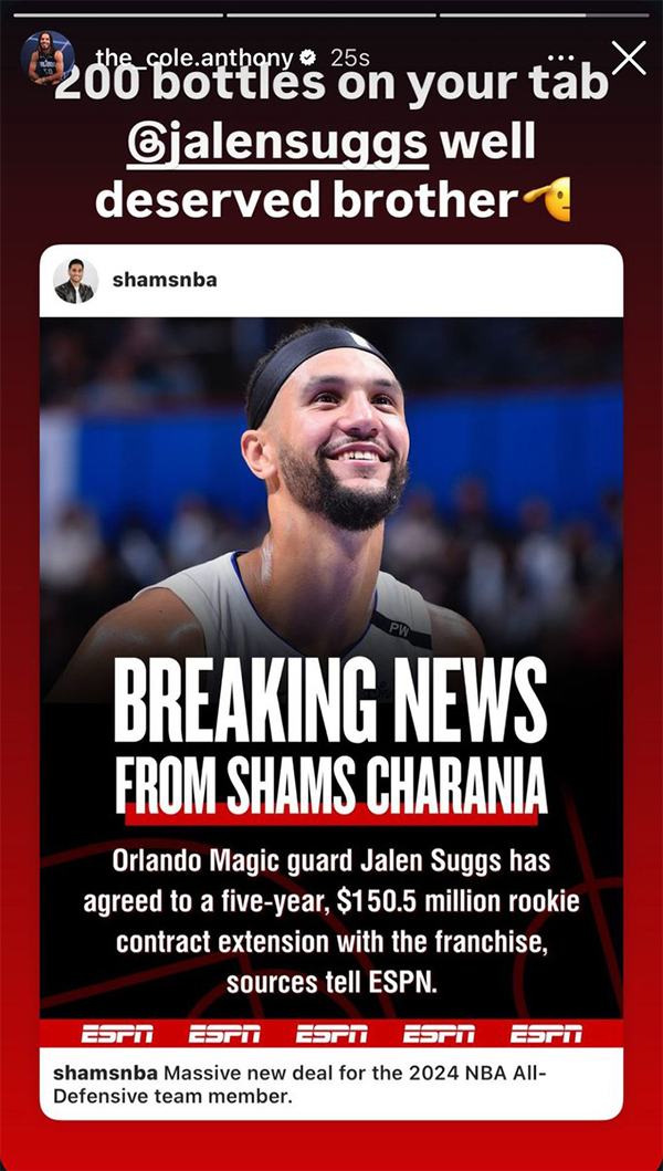 萨格斯续约后,魔术球员科尔-安东尼第一时间更新动态,祝贺萨格斯的同时表示:200瓶酒你得付了,兄弟,你值得拥有。