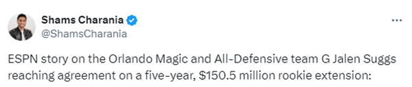 此前名记Marc Stein曾报道,魔术防守王牌杰伦-萨格斯正在与魔术进行续约谈判,寻求一份每年价值至少3000万美元的新合同,如今在续约的截止日的最后一天,萨格斯的代表与魔术管理层在奥兰多会面谈判,最终达成了这一份5年续约合同。